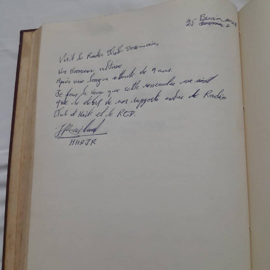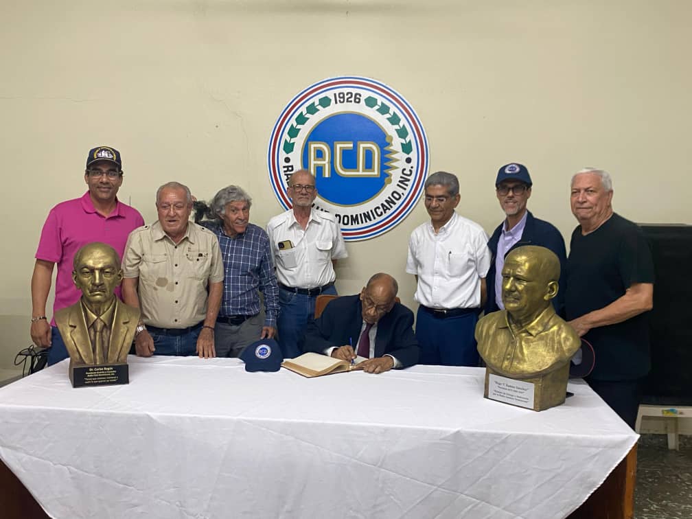 Hugo HI8VRD a ma droite, le president sortant, et Ruben Gonzales HI8RG le nouveau president RCD, lors de la signature du livre d'honneur commemorant notre premiete visite.